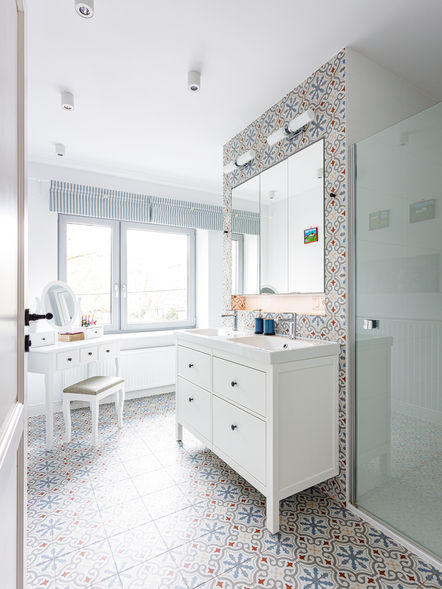 Cały projekt był kompromisem między kolorową duszą właścicielki a funkcjonalnością właściciela. Powstała bardzo ergonomiczna kuchnia z meblami z Ikei oraz płytkami dostępnymi od ręki. Łazienka na piętrze powstała z pokoju. Jest dość spora ale mało ustawna - dzięki ściance na środku łazienki powstało miejsce na wc po lewej stronie i miejsce na prysznic po prawej stronie. Meble z Ikea idealnie tutaj pasują. Łazienka na poddaszu jest przeznaczona dla nastoletnich dzieci inwestora. Postawiliśmy na ergonomiczne i ponadczasowe rozwiązania.